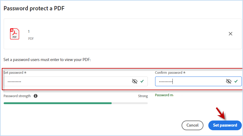 第七步:選擇後,輸入密碼並確認。然後點擊設置密碼開始保護 PDF。