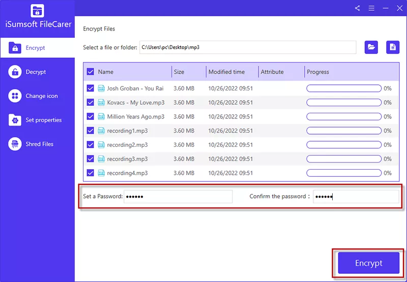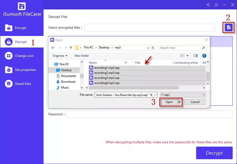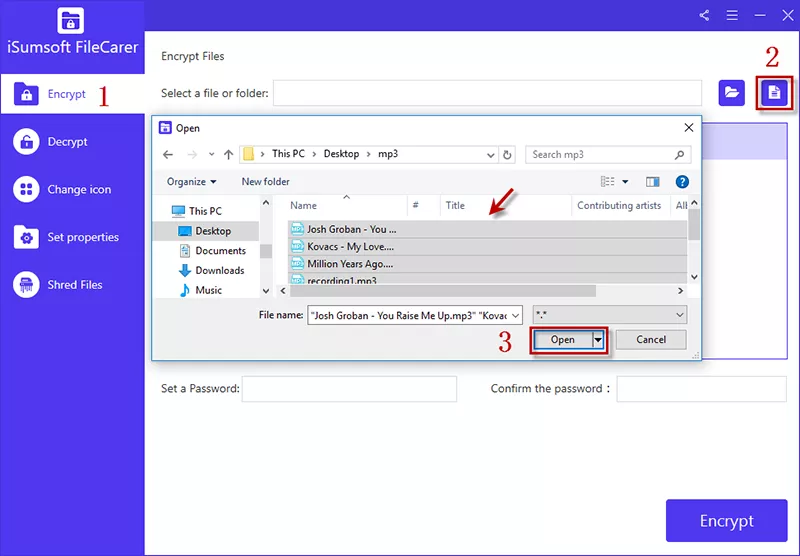 在 iSoft FileCarer 中,選擇加密選項。然後單擊文件圖標,選擇 mp3 音頻文件並單擊打開按鈕將它們添加到加密目錄中。請注意,您可以按Ctrl + A鍵選擇所有 mp3 音頻文件。