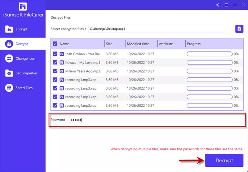 然後輸入正確的密碼並按解密按鈕可刪除 mp3 文件上的加密。完成後,您可以再次訪問並播放 mp3 音頻文件。
