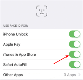 在“使用 Face ID”部分下,打開 iTunes 和 App Store 旁邊的開關。