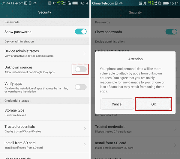 尖端:如果你想打開“已知來源”,一旦你改變了它的設置,它就會提示你可能對你的Android手機造成的損害。如果您確定,請在彈出窗口中單擊“確定”注意力就可以成功開啟了。