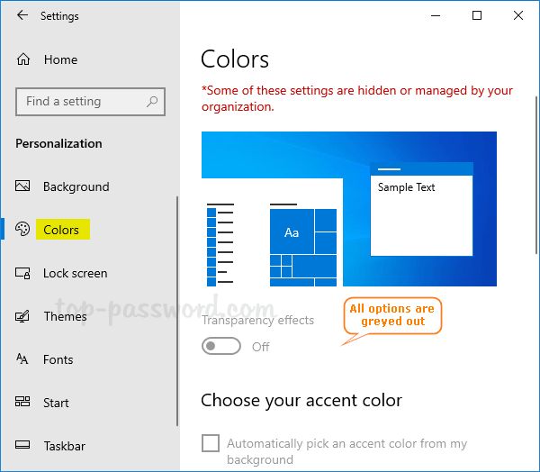 Personalization -> Colors您會發現該頁面上的所有選項均呈灰色。