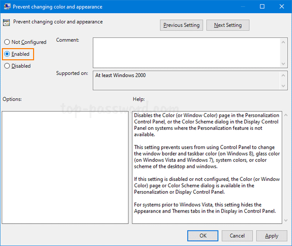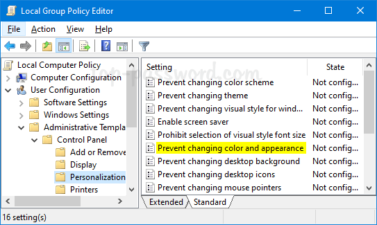 User Configuration -> Administrative Templates -> Control Panel -> Personalization。按兩下"防止顏色和外觀改變”政策在右邊。