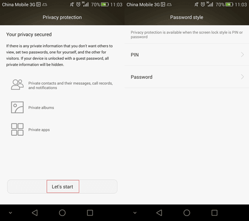 步驟2:點擊 ”讓我們開始吧當您閱讀有關隱私保護的介紹並確保您確實想要對某些聯繫人及其消息、通話記錄以及通知、相冊和應用程序進行隱私保護時。