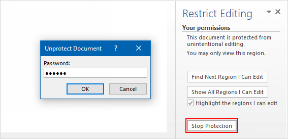 要刪除限制,請單擊停止保護, 後輸入正確的密碼您可以解鎖當前的Word文檔以進行編輯。查看沒有密碼的無保護Word文檔的更多方法。