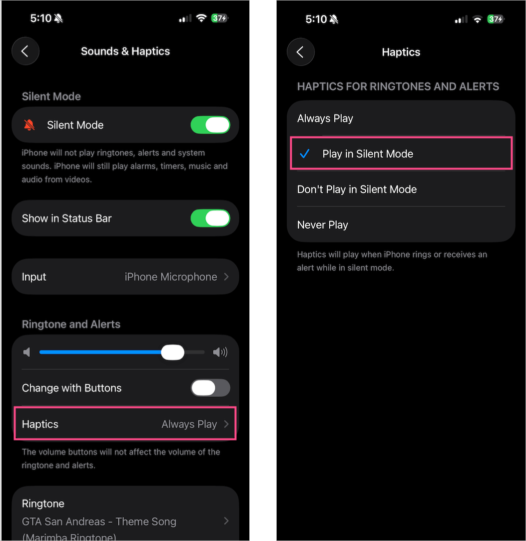 打開設置 > 聲音和触覺 >觸覺,然後選擇“不要在靜音模式下玩。”當靜音模式處於活動狀態時,這將完全禁用振動。