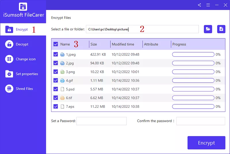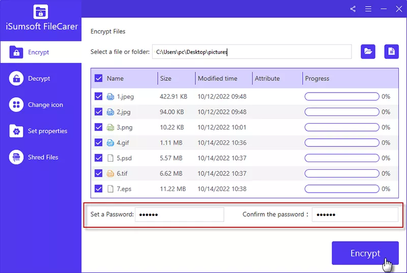 步驟1:打開iSoft FileCarer並選擇加密。旁邊會有一個字段選擇文件或文件夾,您可以輸入圖片存儲的路徑。或者,您也可以單擊文件夾/文件圖標右上角選擇您的照片。