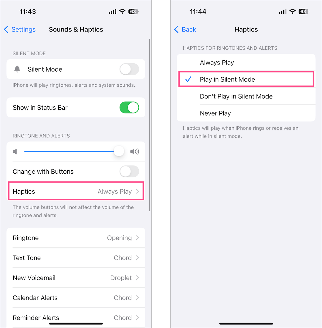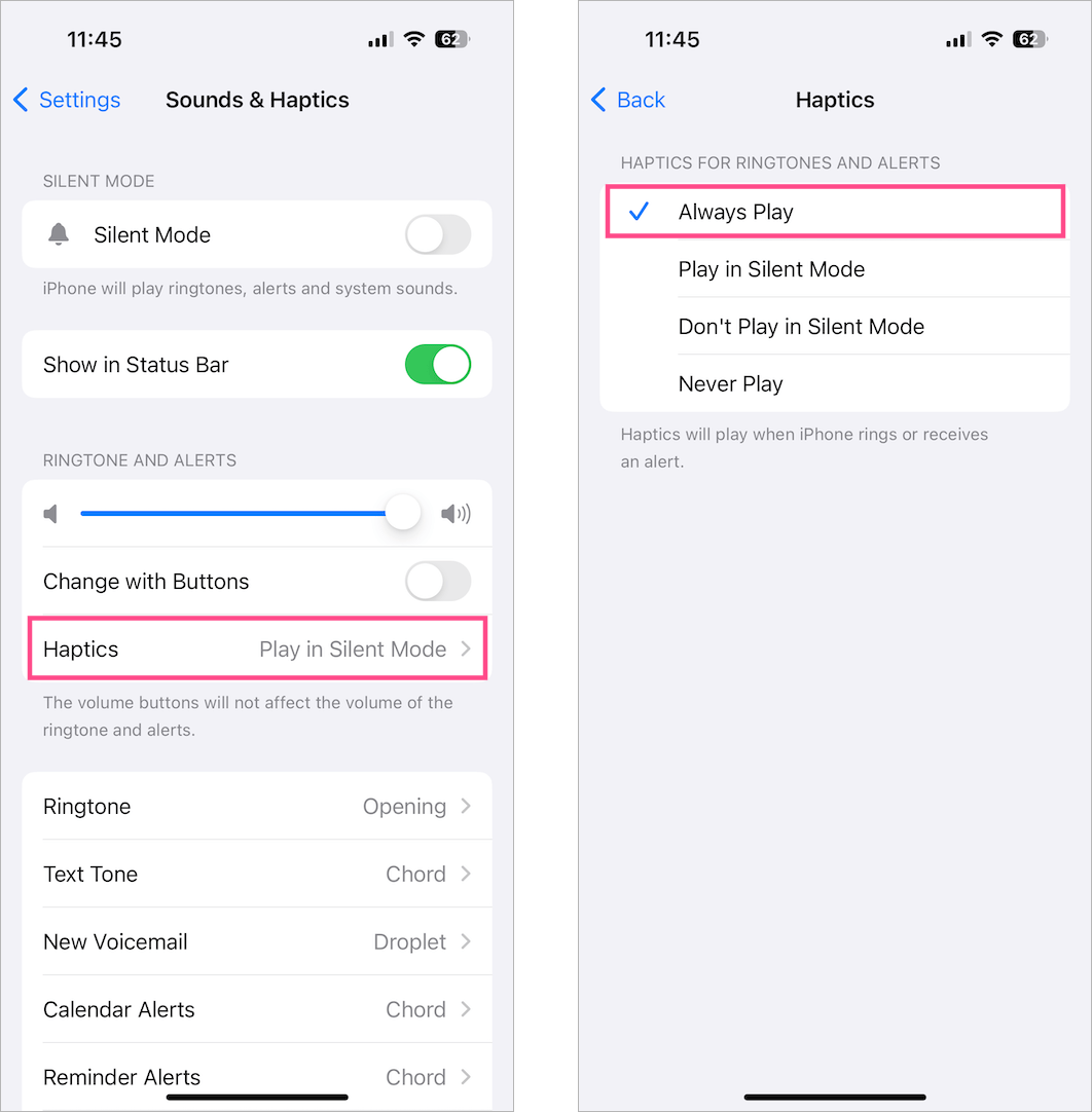 如果您想在靜音模式下啟用振動或希望在響鈴模式下關閉振動,那麼這是可能的。 iPhone 提供了單獨打開或關閉響鈴和靜音模式振動的選項。