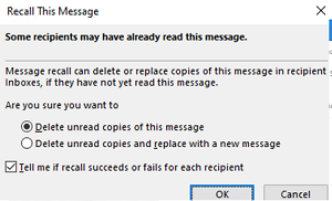 Delete unread copies of these messages或者Delete unread copies and replicas with a new message。第二個允許您編輯原始電子郵件並將其替換到收件人的郵箱中。要獲取有關每個郵箱的電子郵件撤回狀態的通知,請啟用該選項Tell me if recall succeeds or fails for each recipient。