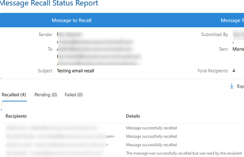 一段時間後,您應該會收到有關每個收件人的召回狀態的報告。該報告可以表明