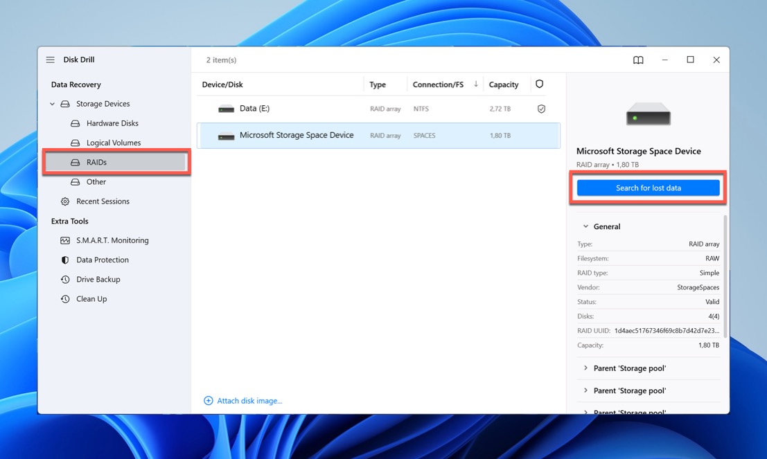 - 啟動磁盤鑽並掃描您的存儲空間池。首先,導航到在存儲設備下發現的“突襲”選項卡。在這裡,必須選擇整個存儲空間池,而不僅僅是一個驅動器。這是至關重要的,這是由於數據副本在整個池中分佈的方式。選擇後,您可以通過單擊“搜索丟失數據”按鈕開始掃描。