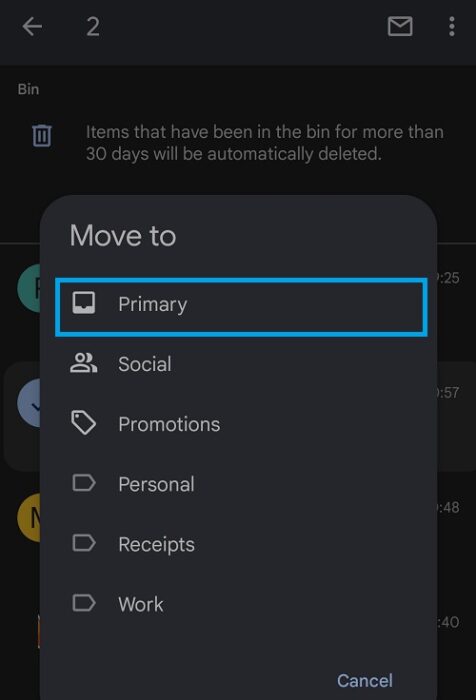 6. 點擊已恢復電子郵件的所需目的地。在此演示中,我選擇“主要”將電子郵件發送回我的收件箱。