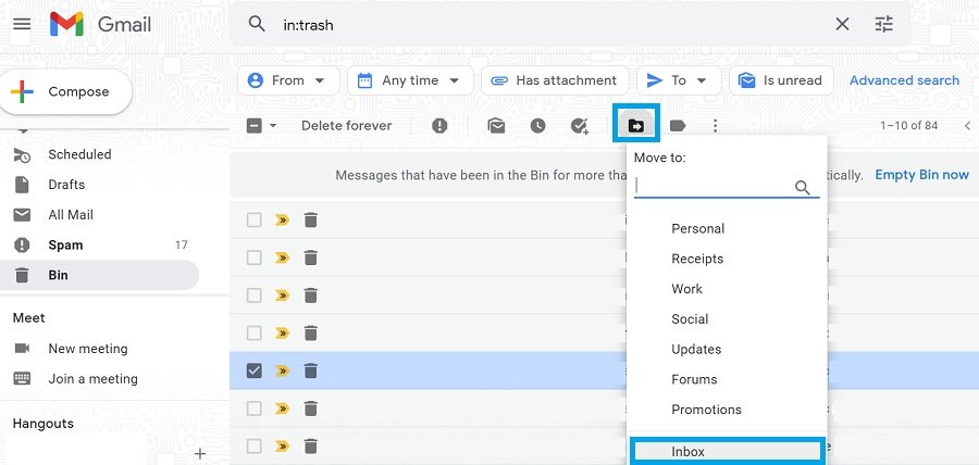5. 單擊“移至”按鈕並選擇要恢復已刪除電子郵件的位置。在此示例中,我選擇“收件箱”作為目的地。