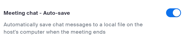 在 Zoom 設置中啟用“自動保存聊天”,或在會議期間手動單擊“保存聊天”。無需錄製即可保存在本地會議聊天中。