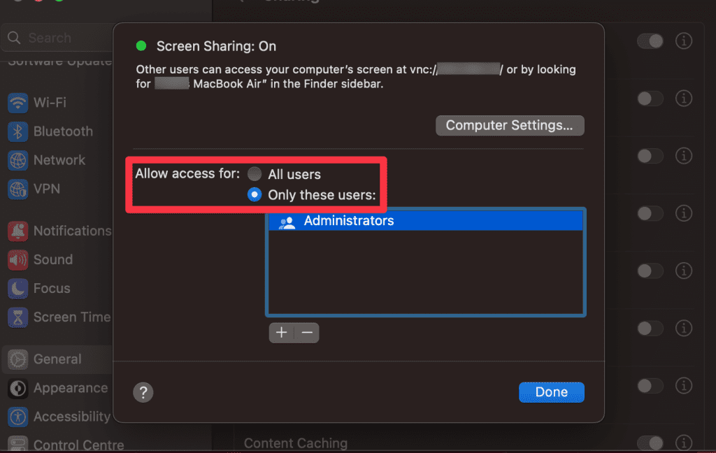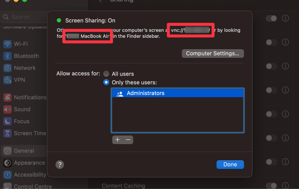裝有 OS X 10.5 或更高版本的 Mac 包含屏幕共享功能,可在同一網絡內輕鬆進行遠程訪問。它還兼容 VNC,允許從任何支持 VNC 的設備進行連接。使用方法如下: