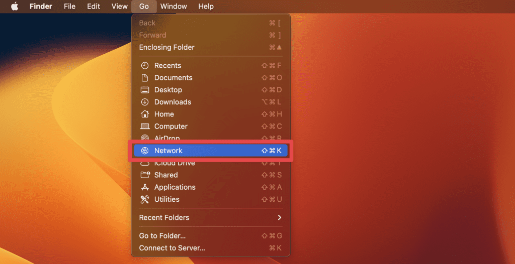 - 在輔助 Mac 上,啟動 Finder 窗口。然後,從頂部菜單中選擇轉到 > 連接到服務器。