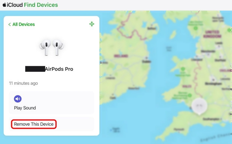 與使用 iPhone 或 Mac 刪除 AirPods 不同,iCloud 方法有其自身的缺陷:當 AirPods 處於活躍在線狀態並已連接時,您無法從您的 Apple ID 中刪除它們。要使您的 AirPods 離線,您必須首先從所鏈接的每個藍牙設備中忘記 AirPods。這包括 iPhone、iPad、Mac 或仍然記得 AirPods 的設備。