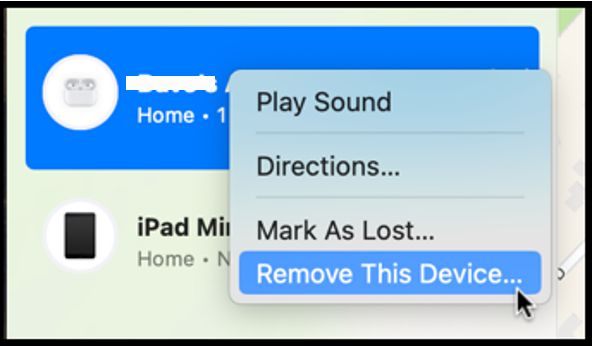 步驟2。按住 Control 鍵並單擊要刪除其 Apple ID 的 AirPods。將出現一個上下文菜單。選擇刪除該設備。