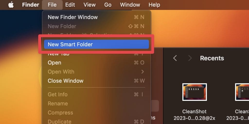 - 在 Mac 上打開 Finder,單擊文件菜單,然後選擇新的智能文件夾。