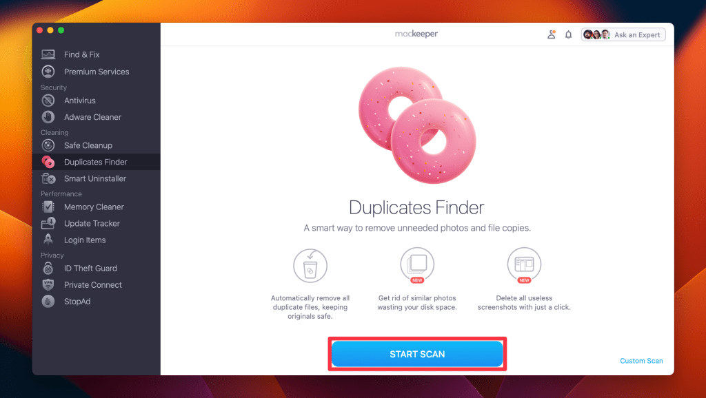 MacKeeper 的重複項查找器快速、簡單,一鍵即可清除空間。以下是使用 MacKeeper 從 Mac 中刪除重複文件的方法: