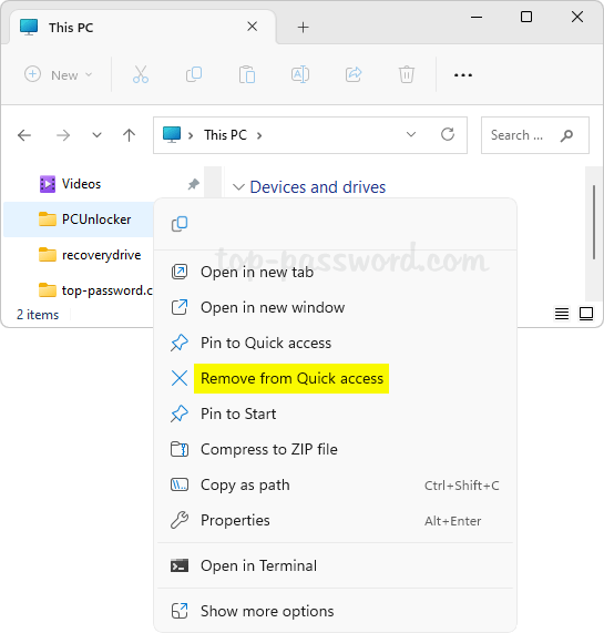 - 打開文件資源管理器。右鍵單擊左側導航窗格中顯示的常用文件夾之一,然後選擇“從快速訪問中刪除”從彈出菜單中。