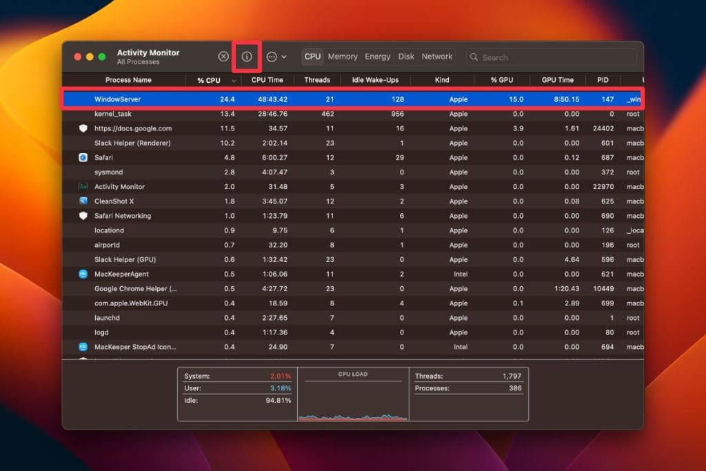 活動監視器是一個內置工具,可讓您檢查所有進程。您可以使用它來查找任何具有可疑名稱或高 CPU 使用率的方法。有時,鍵盤記錄程序隱藏在眾目睽睽之下,對活動監視器進行徹底搜索就會發現它們。