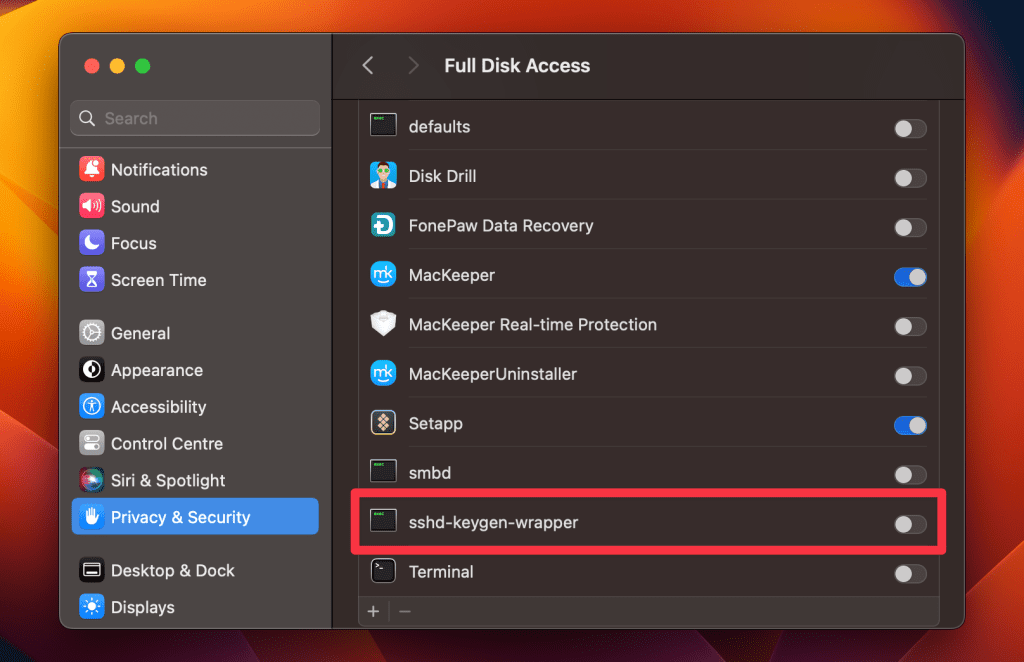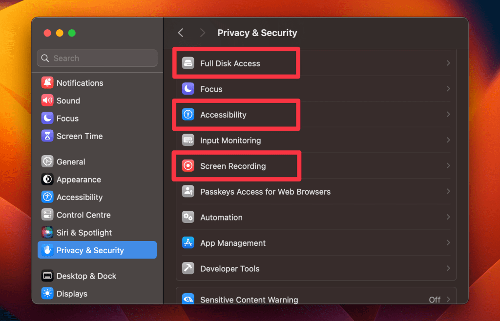 撤銷這些權限可以禁用鍵盤記錄器的功能。以下是如何使用隱私和安全功能從 Mac 上刪除鍵盤記錄程序: