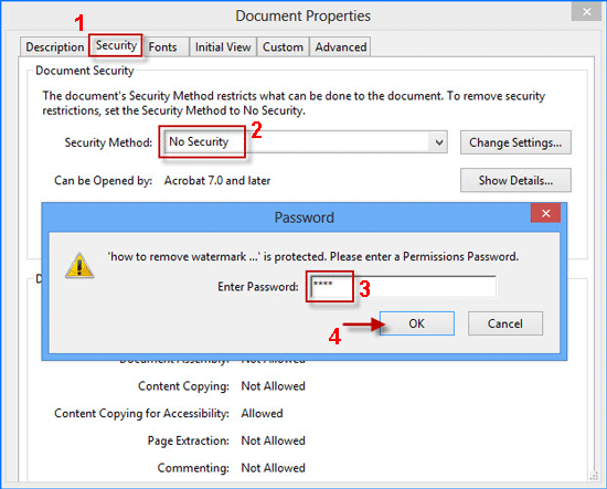 步驟 3:“文檔屬性”窗口打開。選擇安全選項卡,然後選擇沒有安全保障從“安全方法”下拉菜單中。