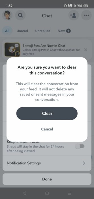 - 確認:最後,點擊“清除”並確認您的操作。此操作將從您的主聊天源中隱藏聊天機器人的對話。