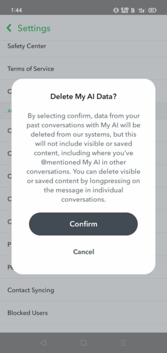 - 確認:確認清除操作將從您的 Snapchat 帳戶中刪除與 My AI 相關的數據。