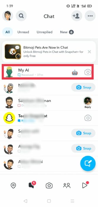 - 找到聊天機器人:滾動瀏覽聊天列表以找到聊天機器人。它可能有不同的個人資料圖片或名稱,表示“我的 AI”。