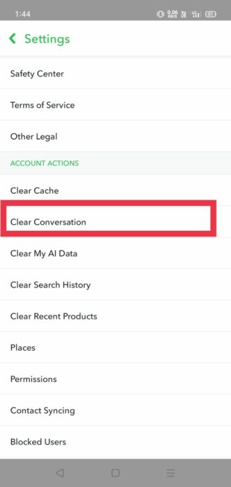 - 向下滾動:滾動瀏覽選項,直到找到標有“帳戶操作”或類似內容的部分。單擊此部分中的“清除對話”。