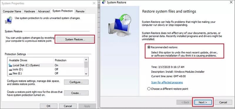 如果最近發生系統損壞,回滾到以前的還原點會有所幫助。