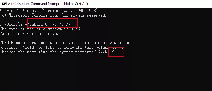 步驟3:如果出現提示,請輸入是並按 Enter 鍵安排下次重新啟動時進行掃描。