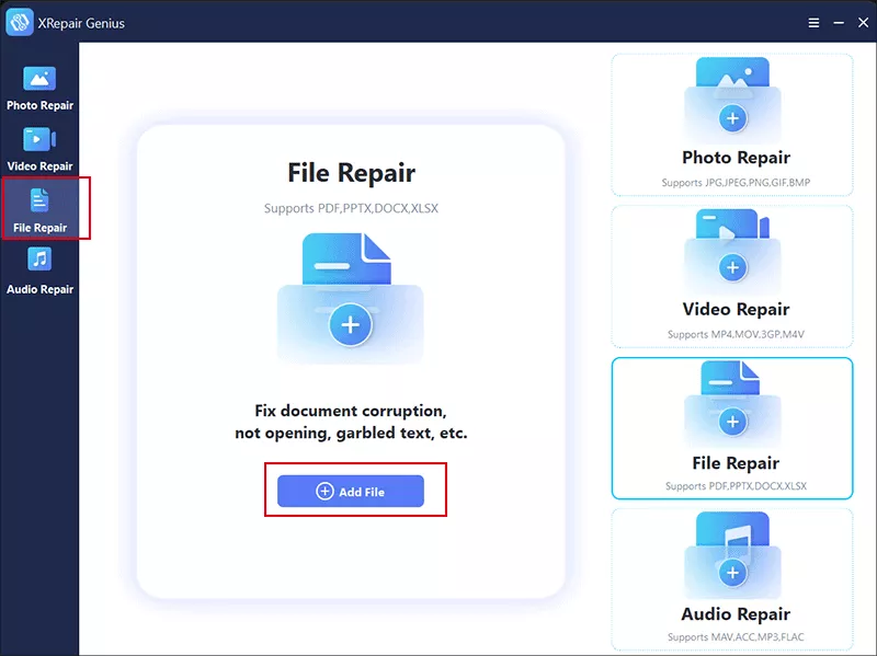步驟一:啟動 XRepair Genius 並選擇文件修復選項開始。然後單擊添加文件按鈕以選擇計算機中所有損壞的文件進行導入。