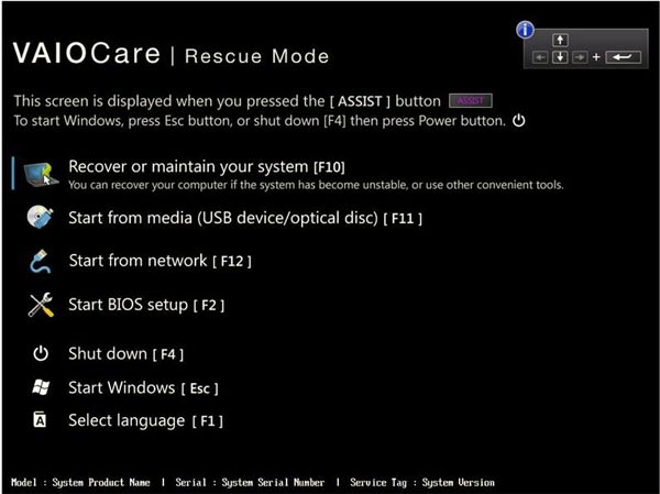 將 Live CD 放入鎖定的 Windows 8 Sony 筆記本電腦的 CD 驅動器中。現在我們需要對計算機進行一些更改,以便使其從 Live CD 啟動。關閉計算機電源,按協助鍵進入VAOcare 救援模式啟動螢幕.