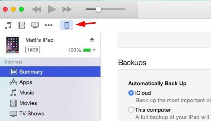 2. 單擊 iTunes 工具欄中的設備圖標。