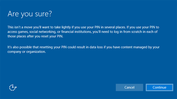 - 隨後的屏幕將警告您重置 PIN 碼可能會導致數據丟失。點擊繼續確認。