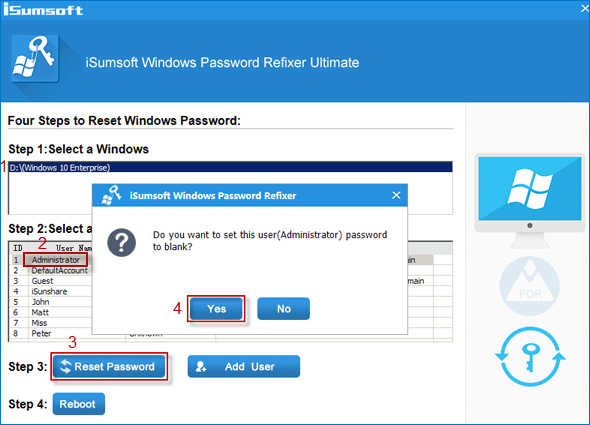 HUAWEI MateBook從U盤啟動後,Windows 密碼修復器將訪問您的系統並在屏幕上顯示所有用戶帳戶。選擇其中一個用戶名,然後單擊重置密碼按鈕。