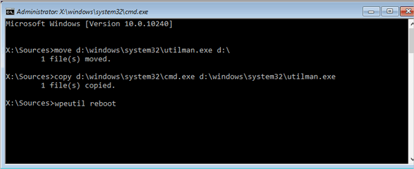 複製D:\ Windows \ System32 \ cmd.exe D:\ Windows \ System32 \ utilman.exe