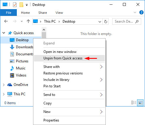 打開文件資源管理器。在左側的“快速訪問”窗格中,右鍵單擊要取消固定的項目,然後選擇“從快速訪問中取消固定” 從下拉菜單中。