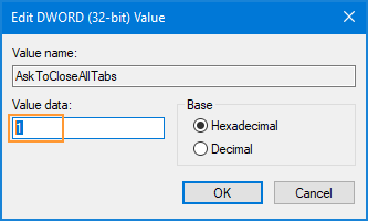 - 如果要在 Microsoft Edge 中啟用“是否要關閉所有選項卡”提示,請將其值數據更改為 1。