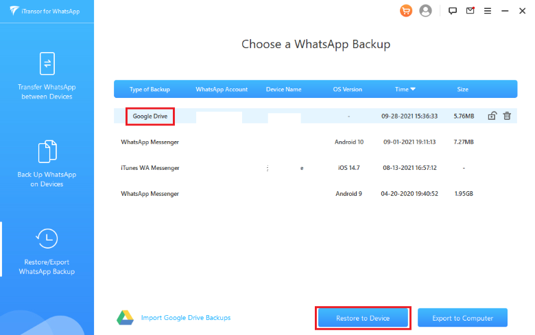 將 WhatsApp 備份從 Google Drive 傳輸到 iPhone 是一回事,但 iTransor for WhatsApp 可以做更多事情。您可以將聊天記錄備份到 PC 或 Mac,而不用將自己鎖定在 iCloud 或 Google Drive 備份中。
