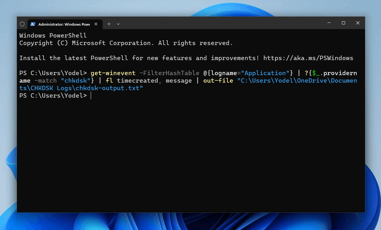 get-winevent -FilterHashTable @{logname="Application"} | ?{$_.providername -match "chkdsk"} | fl timecreated, message | out-file ""