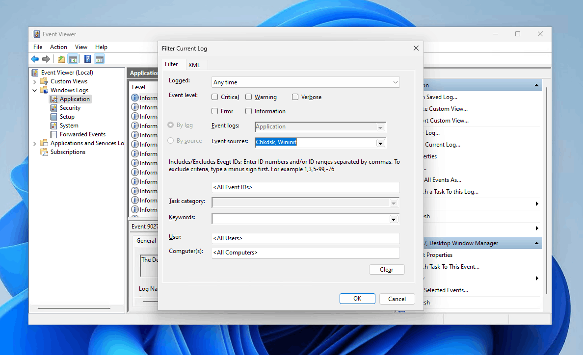 - 好的。選擇chkdsk和Wininit來自事件來源下拉。點擊
