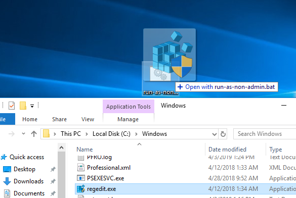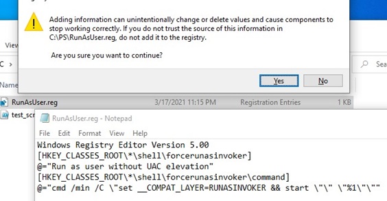 Windows Registry Editor Version 5.00 [HKEY_CLASSES_ROOT*shellforcerunasinvoker] @="Run as user without UAC privilege elevation" [HKEY_CLASSES_ROOT*shellforcerunasinvokercommand] @="cmd /min /C "set __COMPAT_LAYER=RUNASINVOKER && start "" "%1"""