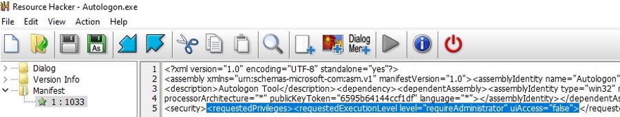 在這種情況下,您可以強製程序使用外部清單文件。創建純文本文件應用程序名稱.exe.manifest(例如,Autologon.exe.manifest)在包含 exe 文件的目錄中,並將 Resource Hacker 中的清單代碼複製到其中。將 requireAdministrator 替換為作為調用者。保存清單文件。