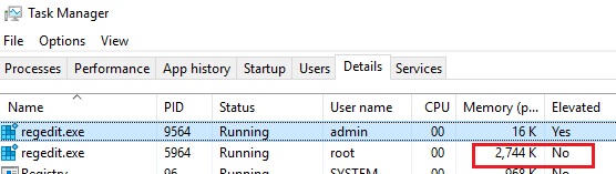 註冊表編輯器應在沒有 UAC 提示且無需輸入管理員密碼的情況下啟動。如果您打開任務管理器並添加高架列中,您將看到存在沒有提升狀態的 regedit.exe 進程(以非管理員用戶權限運行)。