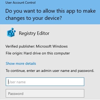 當你跑步時regedit.exe,您將看到一個用戶帳戶控制提示,要求輸入管理員憑據(Do you want to allow this app to make changes to your device?)。如果您不提供密碼且不確認提升,應用程序將不會啟動。