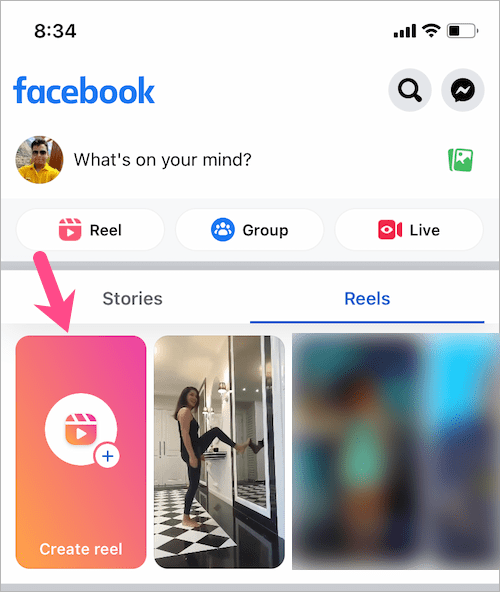 - 打開 Facebook 應用程序並點擊“創建捲軸”選項。